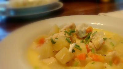 Many of the fish chowders of my youth were as a direct result of fishing trips, where we would 'throw back' everything but the "haddock" ... the king of chowder fish (also the king of baked haddock and fish 'n chips, but that is for another blog). Haddock is a firm white-fleshed fish with a mild flavor ... it should never be even slightly fishy smelling. It has a mark on the side up by the fin that we were always told was the "Devil's thumbprint", left when he made a grab for a haddock and the haddock slipped away. Much to my sorrow, they are pretty well fished-out these days and what is available is very expensive. And, as you can imagine, there is no haddock to be found at all around this neck of the woods.